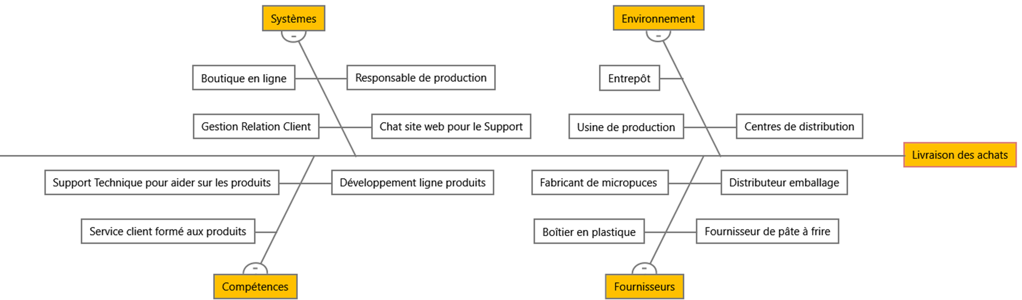 Le diagramme des causes et effets, également appelé diagramme d'Ishikawa, révolutionne le brainstorming en explorant l'impact ou l'effet souhaité et en analysant les causes associées. En effet, il permet de visualiser les causes et les effets en affichant le problème ou l'effet. Les causes contributives possibles sont énumérées sur les petites "lignes" situées sous diverses catégories de causes. Le problème ou l'effet central est placé tout à droite du diagramme des causes et effets. Les affinités, qui sont des catégories de causes, se ramifient à partir de la ligne de l'effet central. Les causes étudiées, quant à elles, se ramifient à partir des affinités.
