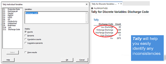 Utilisez Stat > Tableaux > Trier à plat les variables individuelles pour afficher la liste des valeurs uniques et le décompte correspondant dans le panneau de résultats de Minitab. Vous pouvez également stocker les résultats dans la feuille de travail Minitab, une fonctionnalité efficace si vous prévoyez de recoder plus de 100 valeurs uniques à l’aide d’une table de conversion.