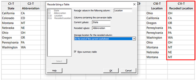 Le menu Données > Recoder peut s’avérer utile pour recoder des valeurs afin de corriger des coquilles ou bien pour recoder des données numériques en texte ou vice versa. Si vous devez recoder plus de 100 valeurs uniques, une table de conversion peut vous aider.