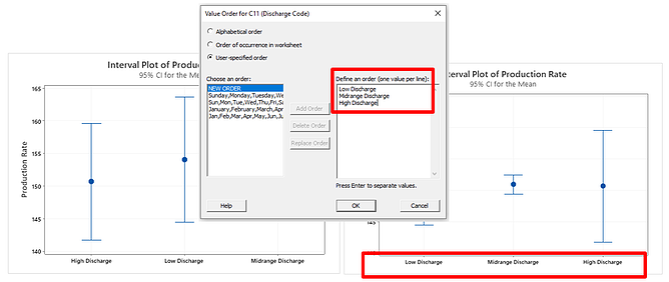 Cliquez avec le bouton droit sur la colonne qui contient les données texte, puis sélectionnez Propriétés de colonne > Ordre des valeurs pour choisir le mode de tri d’une colonne de texte. Par défaut, Minitab utilise l’ordre alphabétique. Vous avez cependant la possibilité de modifier l’ordre pour répondre à la logique de votre analyse.