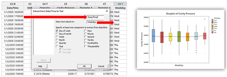 Utilisez Données > Date/Heure > Extraire au format texte pour créer une colonne dans laquelle le jour de la semaine apparaîtra. Cette fonctionnalité est pratique pour créer une colonne de regroupement en vue d’une analyse plus poussée. C’est le cas, notamment, si vous souhaitez visualiser des différences en fonction du jour de la semaine.