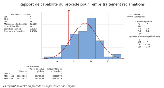 Les réclamations lentes entraînent des frais pour l'organisation de diverses manières, notamment une augmentation des intérêts payés et des liquidités peu fiables. Le plan d'affaires stratégique comprenait un objectif de paiement des réclamations dans les 50 jours afin de préserver une performance financière saine. Nous avons donc procédé à une étude de capabilité afin de mesurer les performances des réclamations traitées. Ainsi, nous pouvons à présent nous attendre à ce que le procédé permette de traiter la plupart des réclamations (883 000 sur un million) en plus de 50 jours.