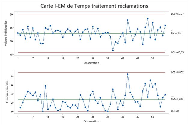 Les cartes individuelles et les cartes d'étendue mobile prouvent que le procédé de paiement des réclamations reste stable avec une moyenne d'environ 53 jours. Les réclamations peuvent varier de manière aléatoire entre 46 et 60 jours sans être considérées comme inhabituelles.