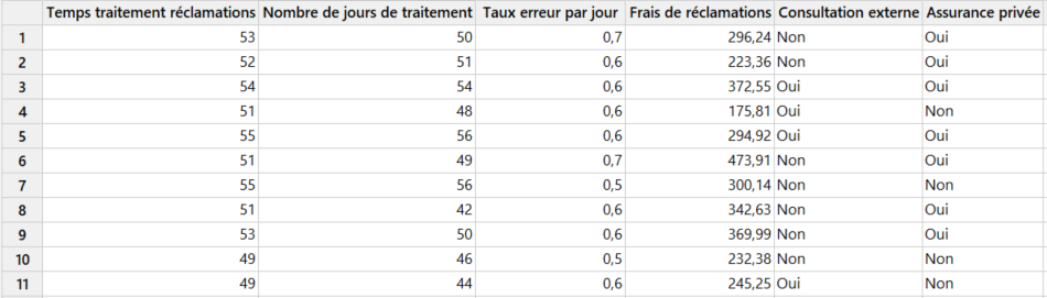 La mesure de production qui nous intéresse est le temps écoulé en jours entre l'initiation et le paiement des réclamations de soins de santé. D'autres facteurs interviennent, comme la charge de travail liée aux réclamations traitées par personne et par jour, le taux d'erreur quotidien (informations manquantes, valeurs incorrectes, etc.) et les frais de transformation. Les champs de données indiquent si la réclamation a impliqué une assurance privée et si la procédure a été considérée comme une consultation externe.