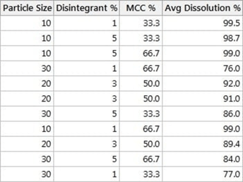 Vous devez déterminer quelles variables d'entrée et quels paramètres d'entrée optimiseront le pourcentage de dissolution à 30 minutes. Le plan d'expériences offre une stratégie efficace de collecte de données. Les entrées sont simultanément ajustées afin de déterminer s'il existe des corrélations entre les entrées et les résultats. (Pour en savoir plus sur les plans d'expériences, consultez l'article 8 conseils d'expert pour établir d'excellents plans d'expériences)