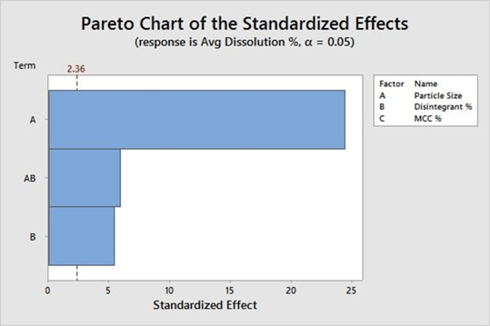 La taille de particule et le pourcentage d'agent de désagrégation ont un impact significatif sur le pourcentage de dissolution, de même que l'interaction entre ces deux facteurs. Le pourcentage de substance de remplissage n'est pas significatif.