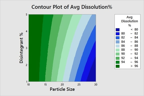 Optimisation de la qualité du produit : maintenant que nous avons identifié les variables essentielles, nous sommes prêts à déterminer les paramètres optimaux pour ces entrées. A l'aide d'un graphique de contour, nous pouvons facilement identifier une fenêtre de procédé pour les paramètres Taille de particule et Pourcentage d'agent de désagrégation nécessaires afin d'obtenir un pourcentage de dissolution de 80 % ou plus.