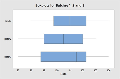 Supposons que nous voulions évaluer l'uniformité du contenu de 3 lots sur 10 sites, une caractéristique essentielle à la qualité. Afin de visualiser la variation intra-lot et la variation inter-lots, et d'identifier d'éventuelles valeurs aberrantes, nous pouvons créer des boîtes à moustaches pour chaque lot. Ce graphique spécifique montre une dispersion homogène des mesures à la fois à l'intérieur de chaque lot et entre les lots. Il n'existe aucune valeur aberrante, valeur que Minitab signale par un astérisque (*).