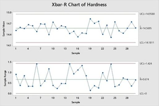 Cette carte X barre-R ne comporte aucun repère rouge. Elle montre donc que le procédé est maîtrisé d'un point de vue statistique. Vous pouvez conclure que vous conservez l'état validé du procédé et qu'aucun changement inhabituel et indésirable n'a été détecté, que ce soit au niveau de la moyenne du procédé (carte X barre supérieure) ou de la variation (carte R inférieure).
