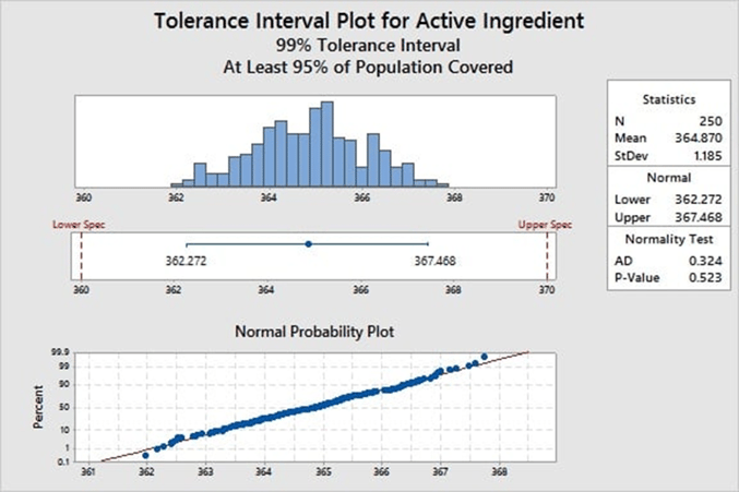 Nous devons peut-être évaluer l'uniformité du contenu avec une confiance de 99 % et une couverture de 99 %. Nous prélevons un échantillon de 30 comprimés et calculons un intervalle de tolérance, révélant que nous pouvons être sûrs à 99 % que 99 % des comprimés présenteront une uniformité du contenu dans une certaine plage, calculée à l'aide de Minitab.
