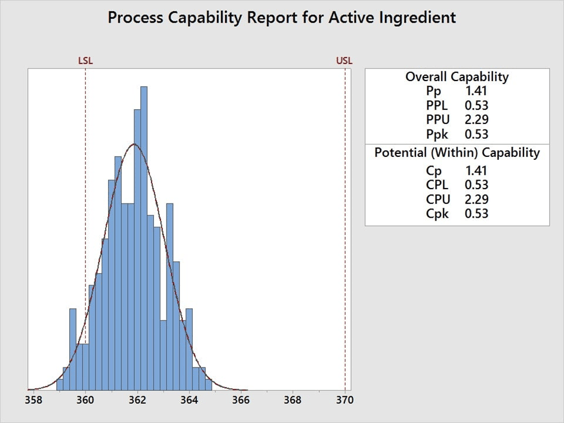 Supposons que la concentration de la substance active d'un tranquillisant doive être comprise entre 360 et 370 mg/ml, et que vous deviez évaluer le niveau de qualité, où une valeur Cpk minimale de 1,33 est définie comme critère d'acceptation. Pour évaluer les performances du procédé et déterminer si les mesures correspondent aux spécifications, utilisez l'analyse de capabilité. Cinq échantillons sont sélectionnés au hasard dans 50 lots et la concentration de la substance active est mesurée. Les données sont ensuite analysées par rapport à la valeur minimale de 360 mg/ml et à la valeur maximale de 370 mg/ml.