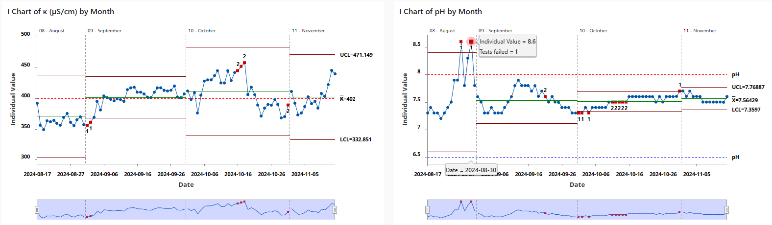Enfin, j'ai décidé d'ajouter des cartes de contrôle montrant la conductivité mesurée et le pH des 90 derniers jours, séparées par mois. J'ai également établi des tests statistiques et des seuils qui, s'ils sont dépassés par la moyenne quotidienne, déclenchent des alertes par SMS, e-mail ou notification dans l'application.