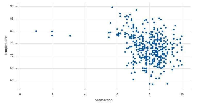チームは、6か月分の運用データと調査データをMinitab Statistical Softwareにインポートしました。Minitab Statistical Softwareは、ゲストのフィードバックを実用的な洞察に変換したいと考えているホスピタリティ業界チーム向けに信頼できるソフトウェアです。Graph Builderを使用して、室温と顧客満足度を比較する散布図を作成しました。