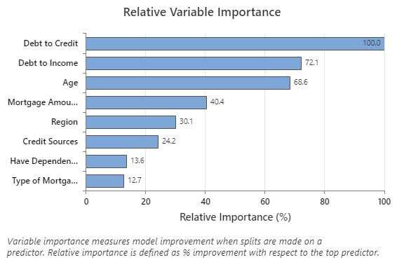 먼저 모형 출력의 일부로 상대 변수 중요도 그래프를 살펴보겠습니다. 상대 변수 중요도 값의 범위는 0%~100%이며, 가장 중요한 변수는 항상 100%입니다. 신용 대비 부채는 담보대출 채무 불이행 예측에 가장 중요한 변수이며, 소득에 대한 부채가 두 번째로 중요한 변수입니다. 9가지 특성 중 8가지는 모형에 어느 정도 중요합니다.