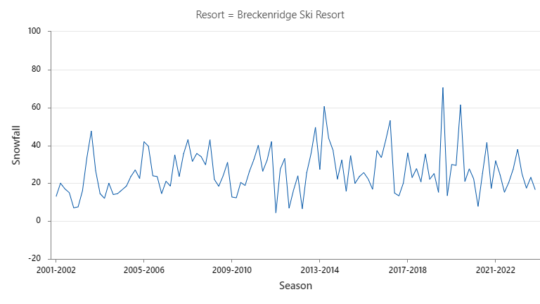 그래프를 보면 3월과 4월에 가파른 감소를 보인 다른 2개 리조트에 비해 Breckenridge의 강설량 성과가 일관되게 우수함을 보였음을 알 수 있습니다.