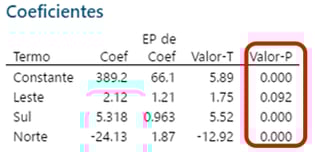 Na saída abaixo, podemos ver que as variáveis preditoras do Sul e do Norte são significativas porque ambos os valores-p são 0,000. No entanto, o valor-p para o Leste (0,092) é maior do que o nível alfa comum de 0,05, o que indica que ele não é estatisticamente significativo.