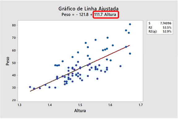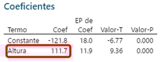 A equação mostra que o coeficiente para a altura em metros é 111,7 kg. O coeficiente indica que para cada metro adicional de altura você pode esperar que o peso aumente, em média, em 111,7 kg.