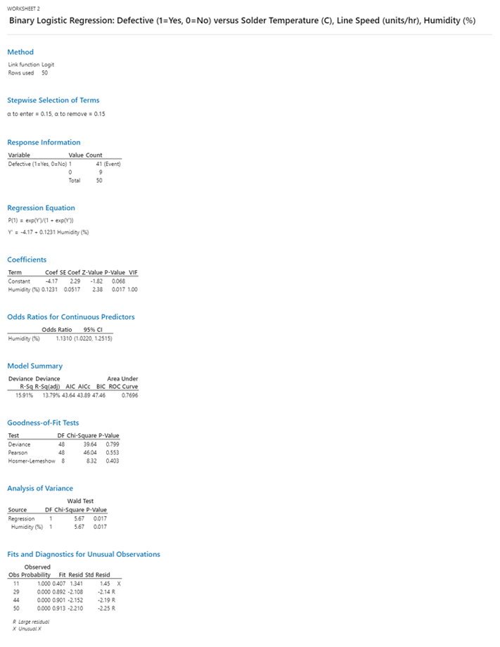 Depois, usamos o Minitab Statistical Software e aplicamos a regressão logística binária stepwise para determinar se algum desses fatores teve um impacto estatisticamente significativo nas taxas de defeitos. Veja o que a Minitab produziu:
