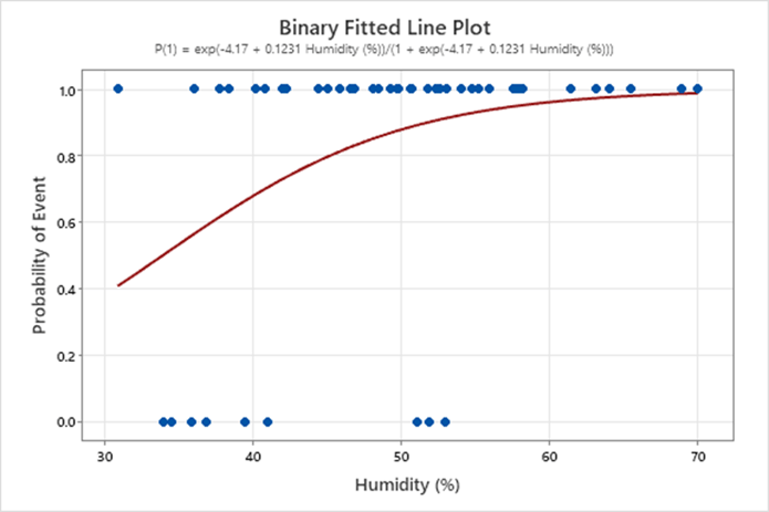 O gráfico de linha ajustada binária de Minitab ajuda a visualizar essa relação. À medida que a umidade aumentava, também aumentava a probabilidade de defeitos:
