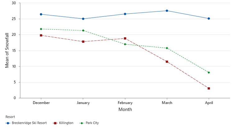 Se você quiser visitar Park City em algum momento do ano, considere ir em dezembro ou janeiro, quando a neve está no auge. Se você está procurando o melhor mês para ir a Killington, pense em fevereiro, que é o único mês em que o resort do leste supera Park City. Usamos o construtor de gráficos do Minitab para escolher os melhores tipos de visualização para comunicar nossos dados. Aqui está um gráfico de linha da média total de queda de neve por mês nas últimas 20 temporadas: