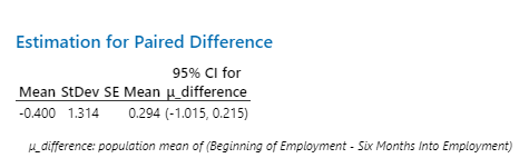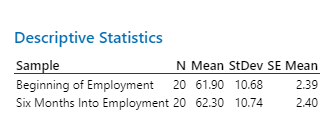 经理在这两个时间段内对之前招聘的员工组进行了此项评估。然后,经理使用配对 t-检验来检验当前的入职和培训过程是否导致员工能力发生了具有统计意义的显著变化。配对 t-检验用于对两个相关组进行比较,以确定它们之间是否存在统计意义上的显著差异,在此实例中,比较的是入职前和入职后的得分。结果如下:
