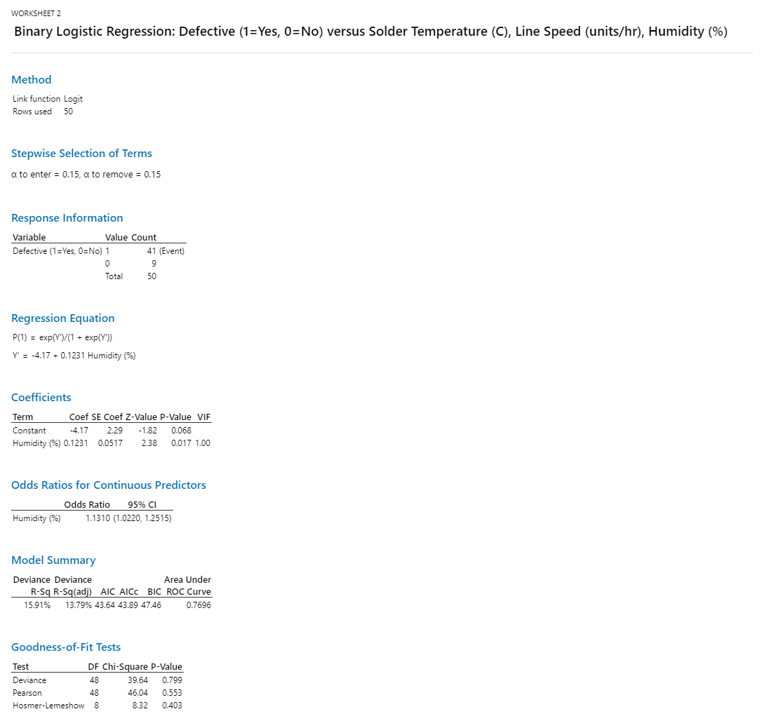 然后,我们使用 Minitab Statistical Software 并应用逐步二元逻辑回归来确定这些因素中的任何一个是否对缺陷率有统计上显著的影响。下面是 Minitab 得出的结论: