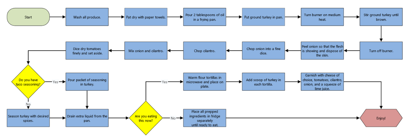 然而,通过 Workspace 中的过程图,我能够浏览每个食谱,为自己提供高效准备一周膳食的资源。下面是我在本周初准备的火鸡玉米饼食谱的过程图,然后我可以在最忙碌的日子里吃到它。