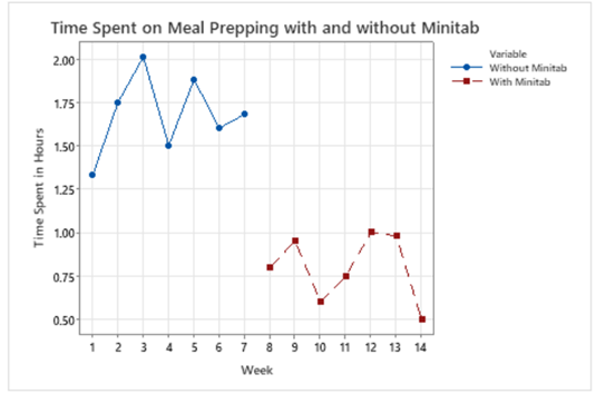 下面您可以看到,当我开始计划和可视化我的过程时,准备饭菜的效率提高了多少。在我开始计划膳食准备之前和之后,在Minitab中使用线图,您可以看到准备膳食所需时间的变化。正如您从 Minitab 生成的描述性统计数据中看到的,在计划和优化之前,我平均需要 1 小时 40 分钟来准备和做饭。使用 Minitab 规划过程并查看可以在哪些方面节省时间后,现在我平均只需 47 分钟即可完成相同的任务。
